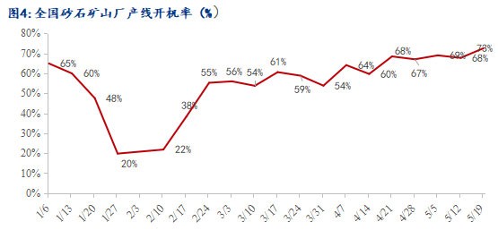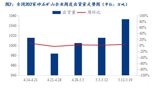 概述:截至5月19日,据统计,本周(5月12日-5月19日)调研的大型矿山企业和砂石加工厂共202家,砂石总出货量约为1052.9万吨。本周砂石总出货量增加37.4万吨,环比上升3.68%。本次调研砂石厂生产线共有354条,其中开机264条,总的产线开机率达到72.58%,环比上升7.12个百分点;产能利用率为36.8%,环比上升3.68个百分点。基建方面,1-4月,铁路方面固定资产投资完成1574.6亿元,同比增长0.6%,全国固定资产总投资增长6.8%。供应方面,上海石材协会砂石分会要求做好复工复产的准备工作,江苏砂石企业也在积极恢复生产,砂石产量有所增加。运输方面,根据发改委消息,油价再次上调,砂石运输用油成本增加。整体来说,全国疫情好转,砂石矿山厂出货量增加,砂石市场有所回暖。