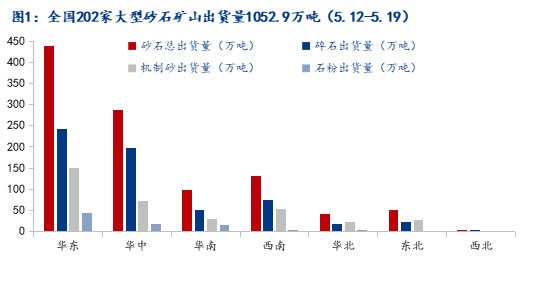从202家大型砂石矿山企业和砂石加工厂的出货量情况来看,华东地区(江苏砂石价格)砂石矿山企业出货量高于其他地区,为438.5万吨。其次为华中地区(湖北砂石价格),出货量为286.92万吨,华北(河北砂石价格)、西北出货量较低。本周调研样本的砂石总出货量增加,与上周相比,本周出货量环比上升3.68%。本周调研的砂石矿山厂出货量增加37.4万吨。本周疫情好转,雨水天气减少,出货量提高。