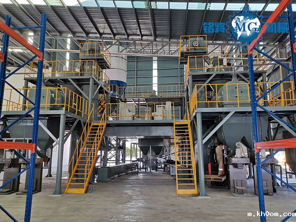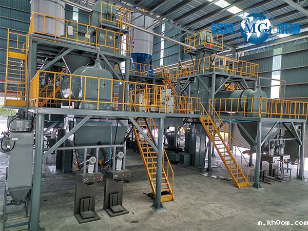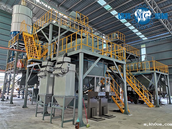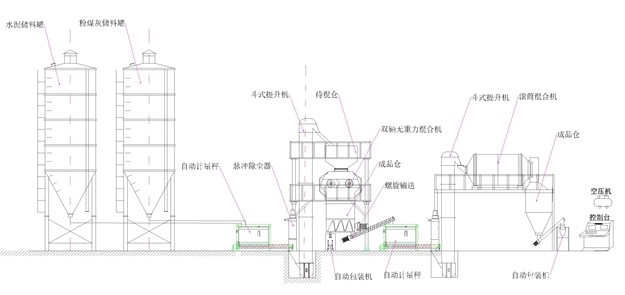 该套生产线在全自动干粉砂浆生产线的基础上,增配针对玻化微珠物理特性专门研制的离心式滚筒混合机及高效专用体积打包机(敞口包装机可选)。该套生产线效率高、产量大、适用性强、操作性好。该套设备实现多点除尘处理,工作环境好,有力保障员工身心健康,创造高效清洁的生产环境。