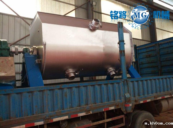 本产品采用U型外观设计,内部采用双层螺带设计。即在水平的主轴上装有两条或多条输送能力相同,螺径不同,螺转方向不同的螺带。通常是当主轴转动时,一条螺带把物料从左至右输送,另一条螺带把物料从右至左输送。因而在机内发生对流穿插混合作用,达到混合均匀的目的。