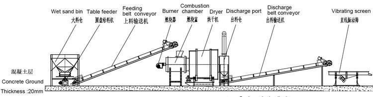 河沙烘干机是由三个不同直径的同心圆筒按照一定的数学关系和结构形式,彼此相嵌组合而成的。根据热功原理,筒内装有不同角度和间距的扬料板和导料板,这种结构能够保证被烘干物料在重力作用下沿着螺旋的运动方向运动,在筒内保持足够的停留时间和充分的分散度,致使物料在筒内与来自燃烧室内的热气流进行充分的热交换,消除了常规烘干设备截面常出现风洞而引起的热交换面积小、单位容积蒸发强度低的缺陷。特殊的三筒结构,使内筒和中筒被外筒包围而形成了一个自身保温系统,内、中筒体表面散发的热量参与到外一层筒内物料的热交换,而外筒又处在热气流的低温端,所以筒体的散热面积和热能损失明显降低。节能型三筒烘干机能充分利用余热,减少散热损失,增加热交换面积,使烘干机的单位容积蒸发强度大大提高,从而有效地提高了热能利用率,降低了能耗,使河沙烘干机的热效率得到较大幅度的提高。