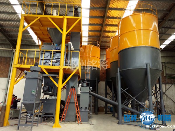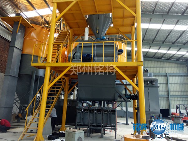 石膏砂浆生产线主要由储料系统、物料输送系统、自动配料系统、高效无重力混合系统、新型收尘系统、空气动力系统、自动包装系统、自动控制系统、优质钢架平台等构成。