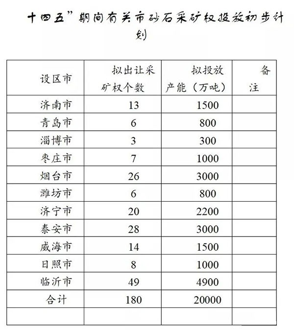 根据砂石资源赋存和可利用性的初步摸底情况,山东省自然资源厅确定了“十四五”期间砂石采矿权投放初步计划(见附件),力争到2025年末,增加供给2亿吨。各市要根据专项调查成果,结合国土空间规划、矿产资源规划等,组织有关部门联审联查、实地踏勘、科学论证,建立砂石采矿权出让储备库。