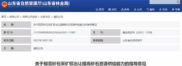 近日,山东自然资源厅发布了《关于规范砂石采矿权出让提高砂石资源供给能力的指导意见》,称,砂石采矿权作为砂石资源供应链的重要源头,对保障砂石资源供需平衡具有重要作用。近年来,山东省统筹兼顾、疏堵结合,整治规范砂石开发秩序,取得明显成效。随着城市化进程加快、基础设施建设投资增长,砂石资源需求仍然呈现刚性态势,山东省多地出现砂石供给紧缺、价格高位运行等突出问题,部分制约了山东省重点工程和重大基础设施项目的建设进度。