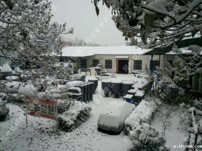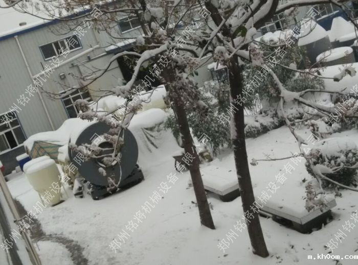 来到公司,车间厂房也盖上了一层“厚厚的白棉花被子”,连我们放在厂院里的设备都盖满了厚厚的一层雪。看保温砂浆设备都“白了头”。下了一夜,积雪非常厚,有十多公分。路都堵住了。